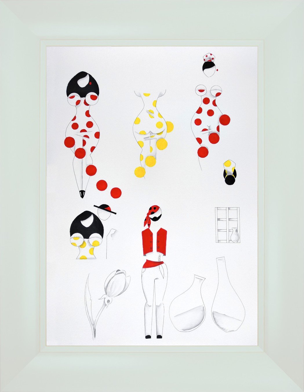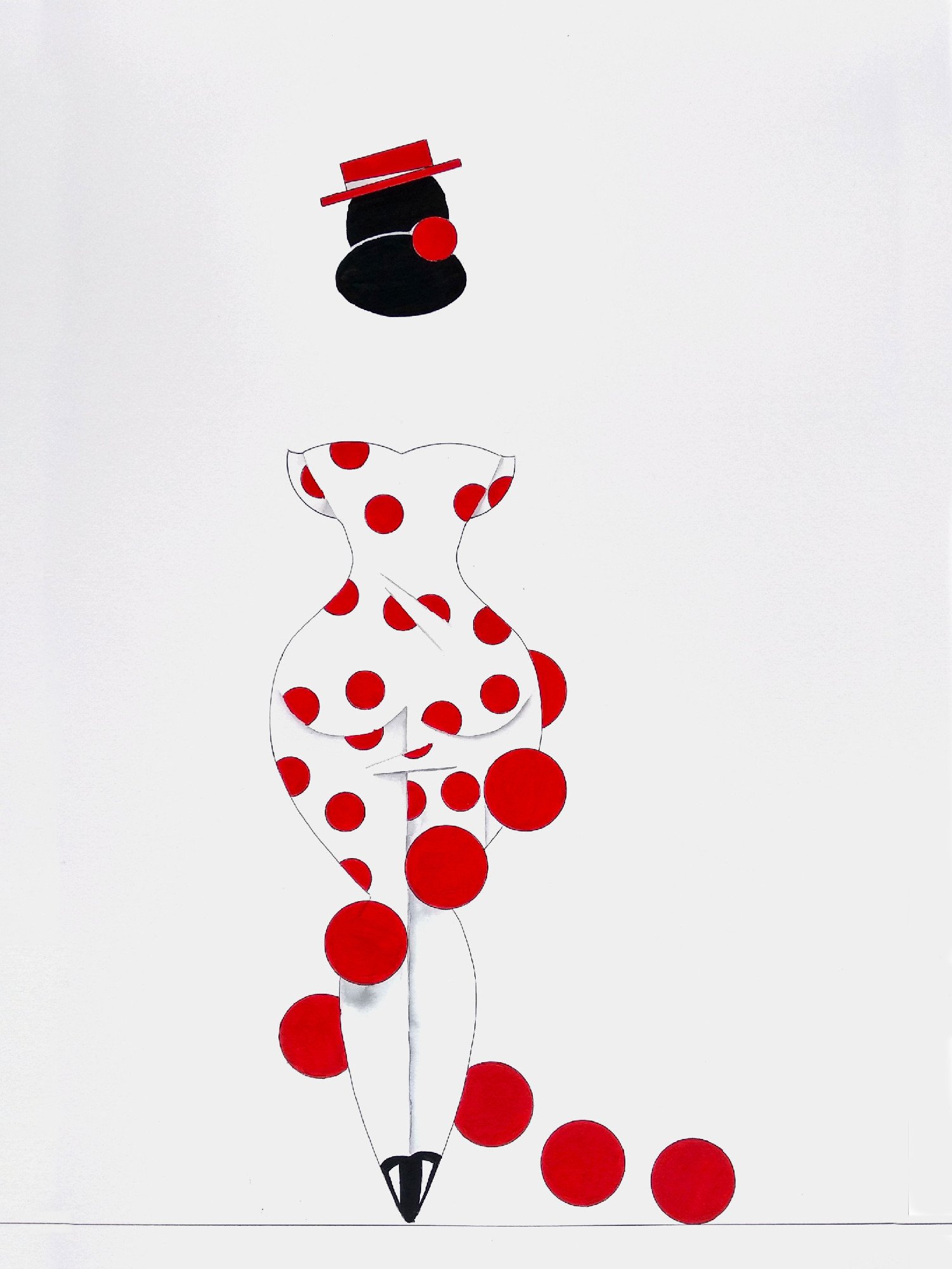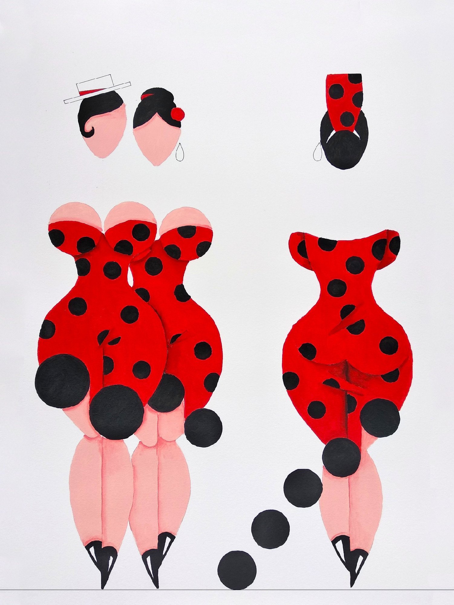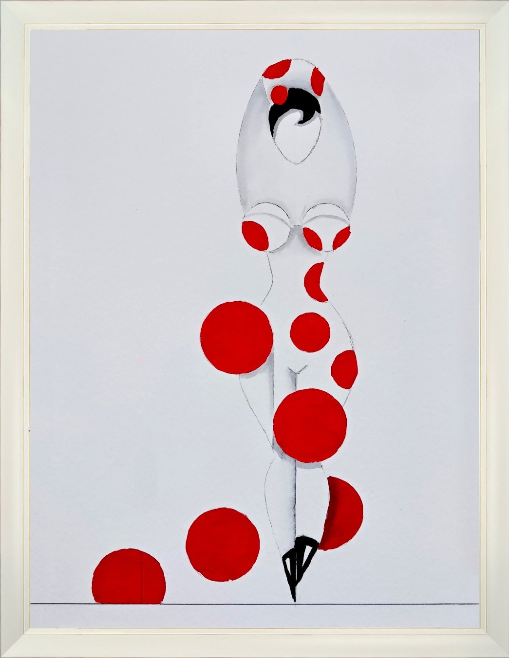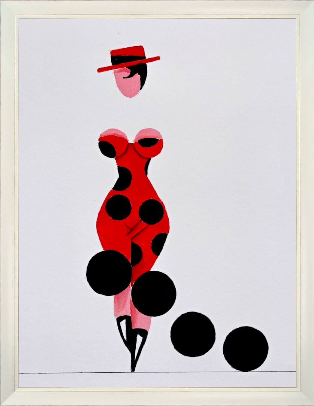 Las formas son simples, los colores puros, los fondos blancos. No hay brazos, ni cuello, ni rasgos que distraigan. La sensualidad aparece en la curva y en la presencia, no en el detalle.