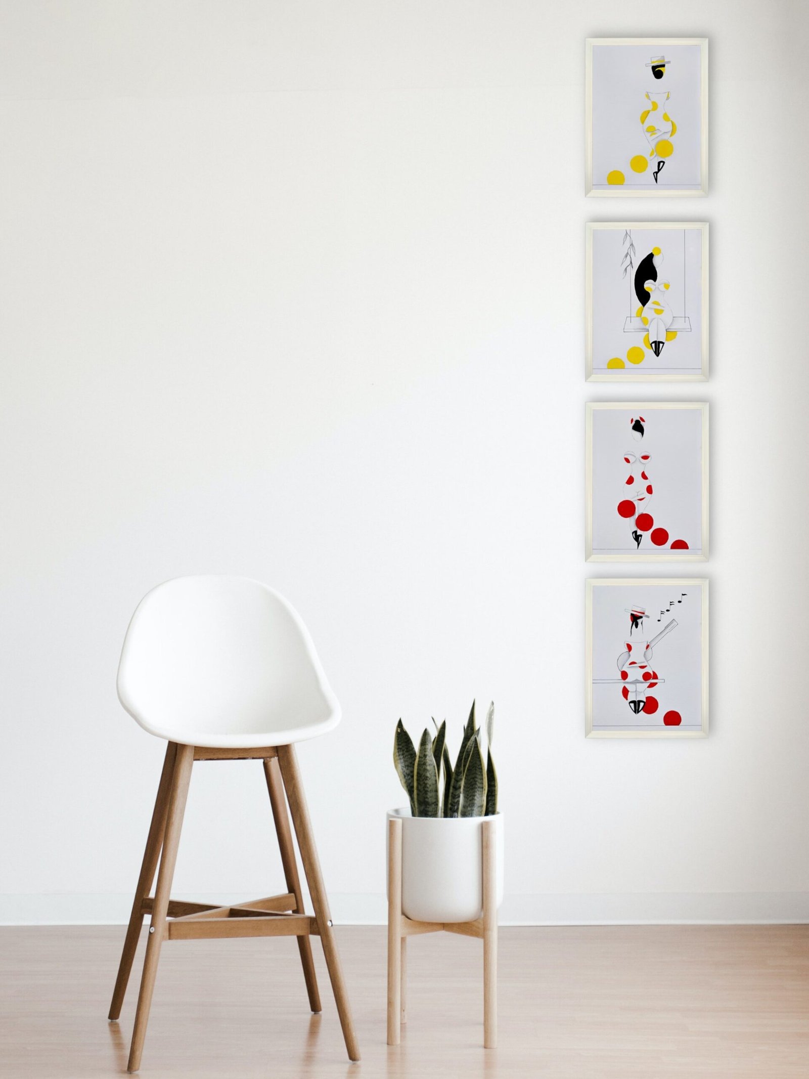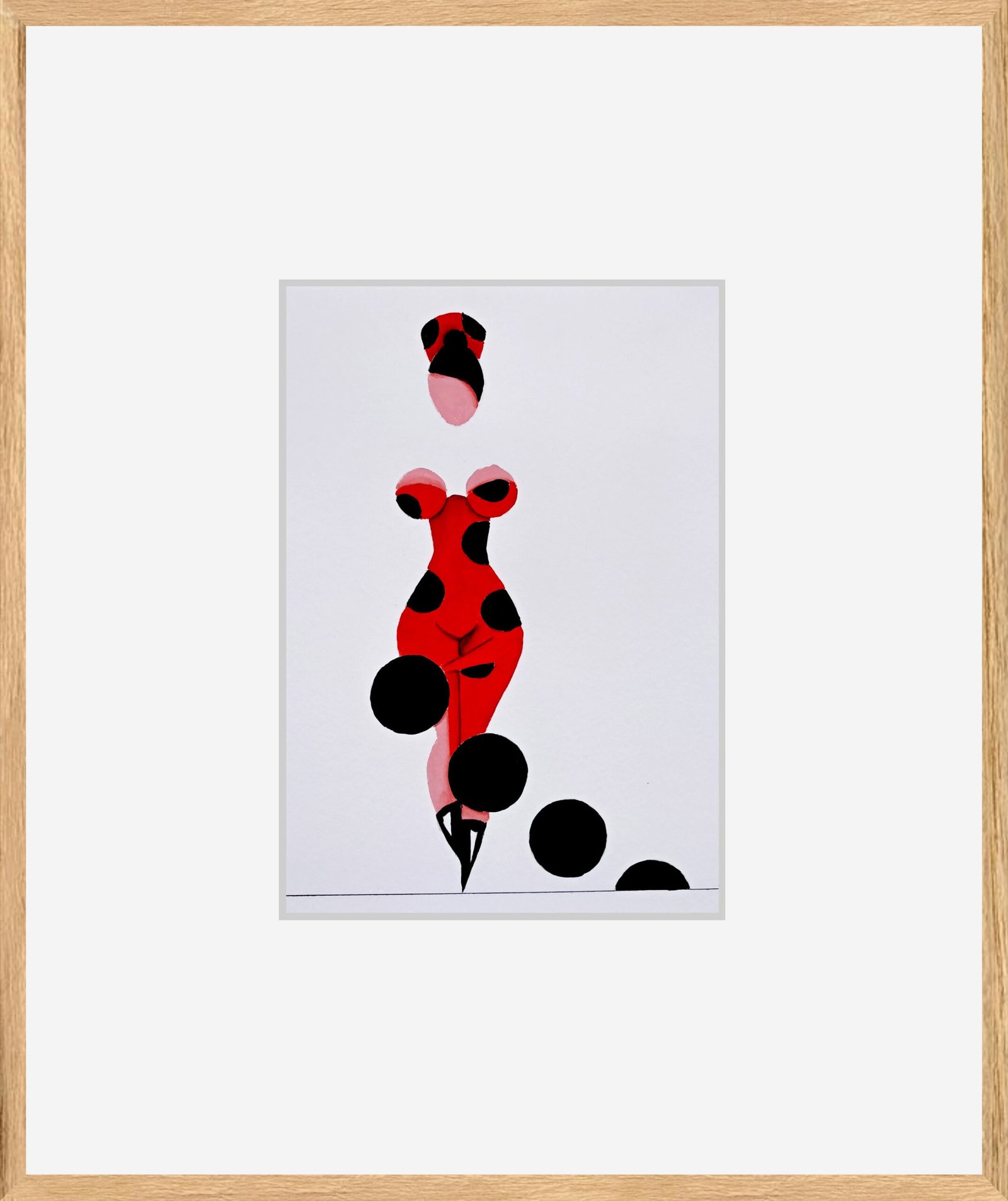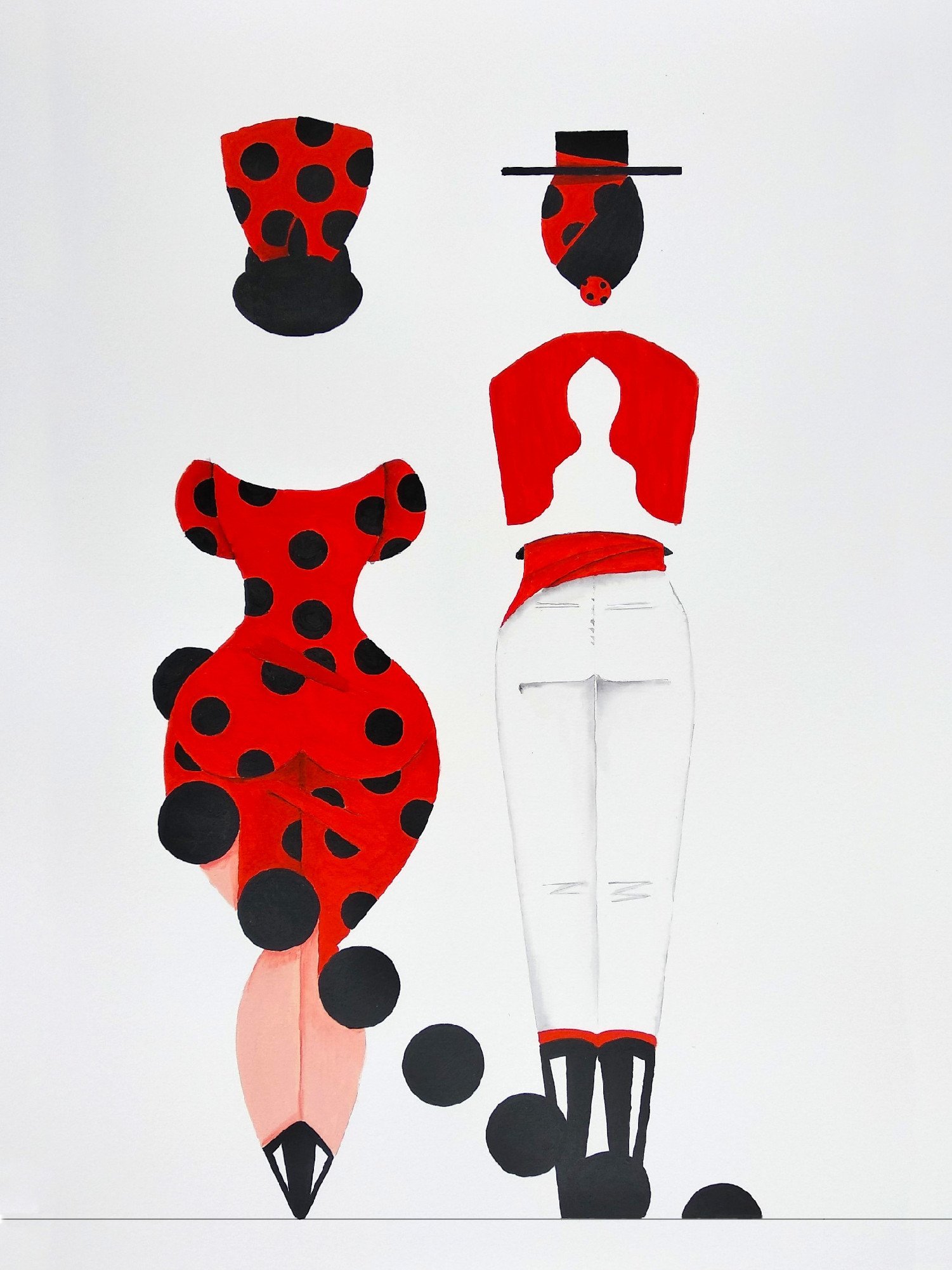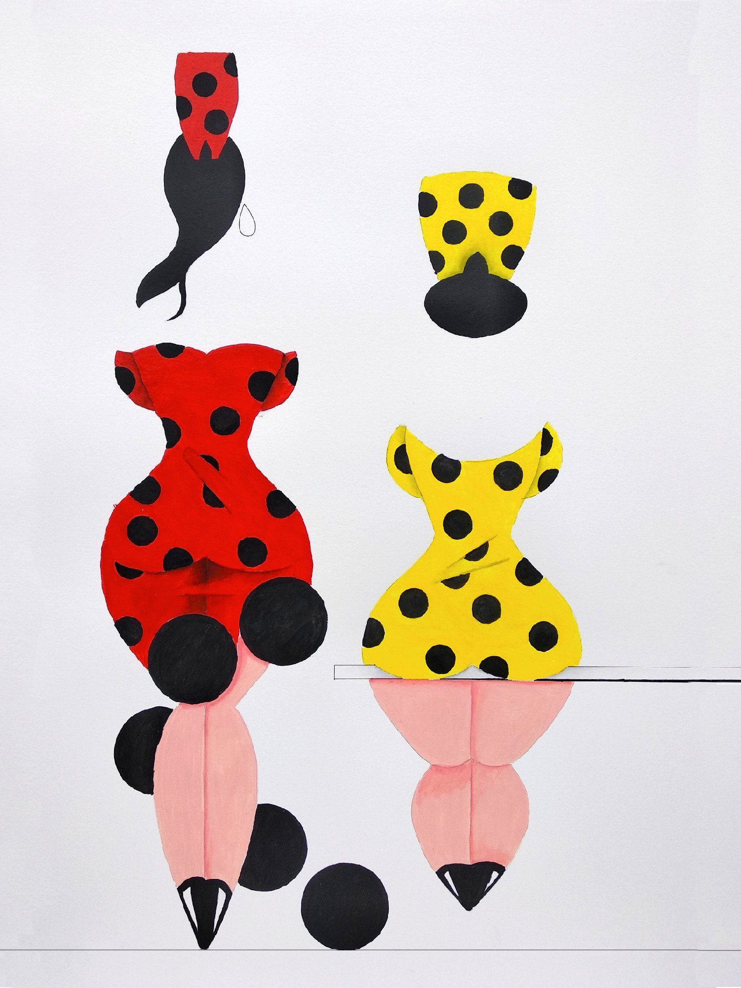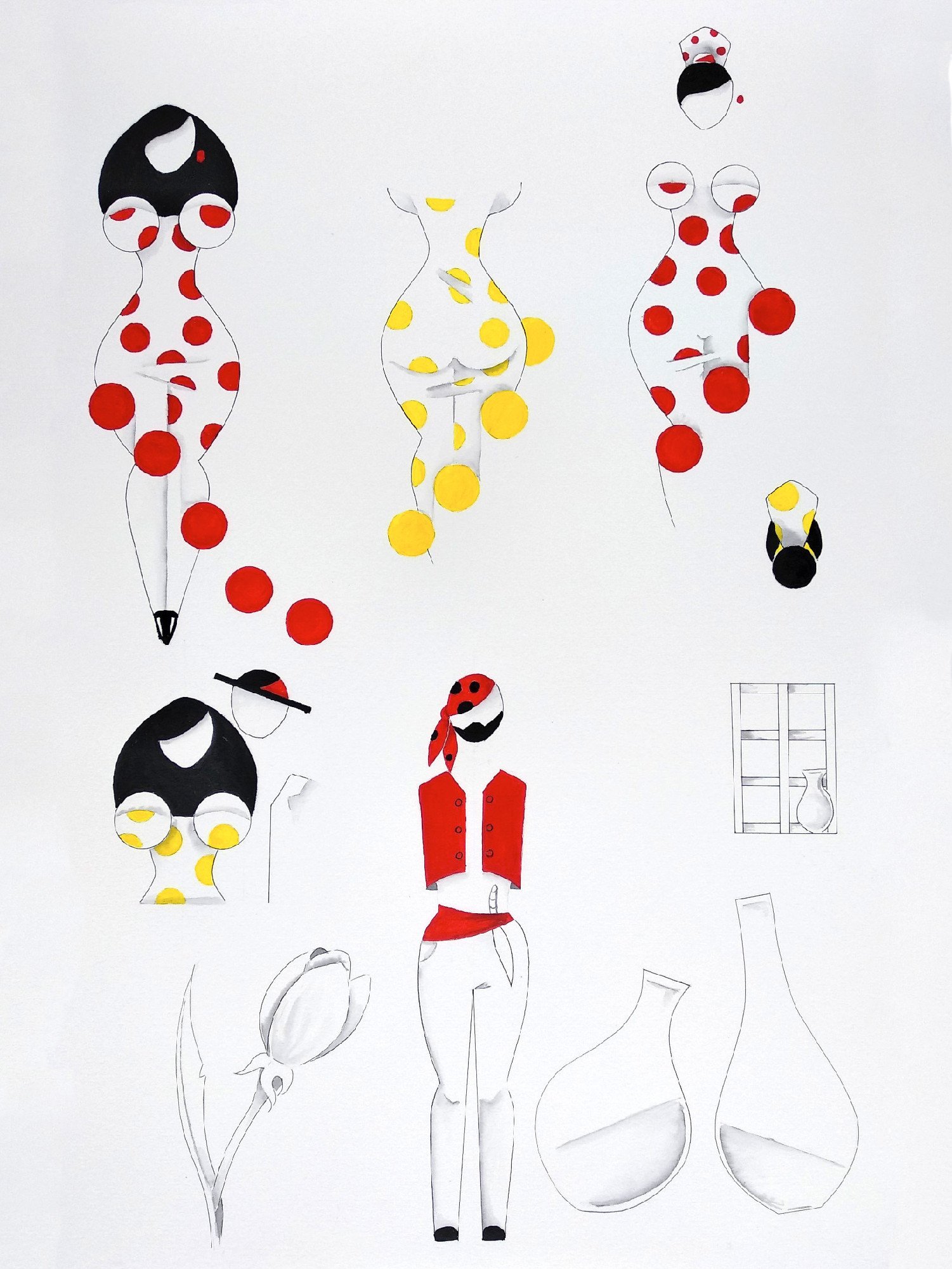 Las formas son simples, los colores puros, los fondos blancos. No hay brazos, ni cuello, ni rasgos que distraigan. La sensualidad aparece en la curva y en la presencia, no en el detalle.