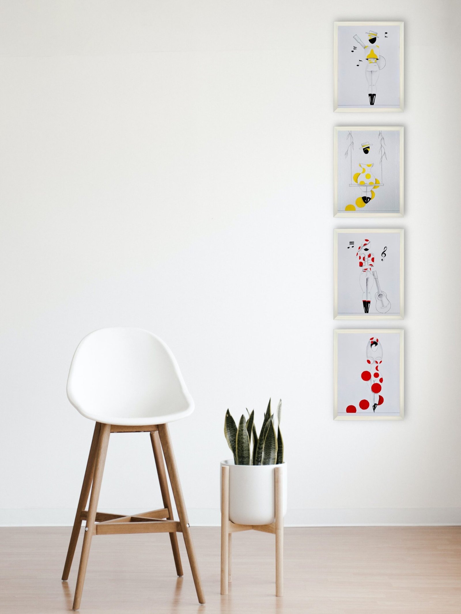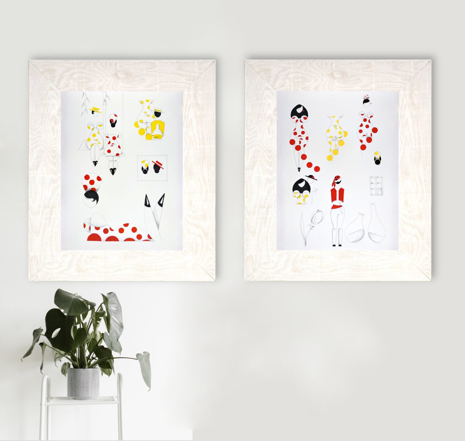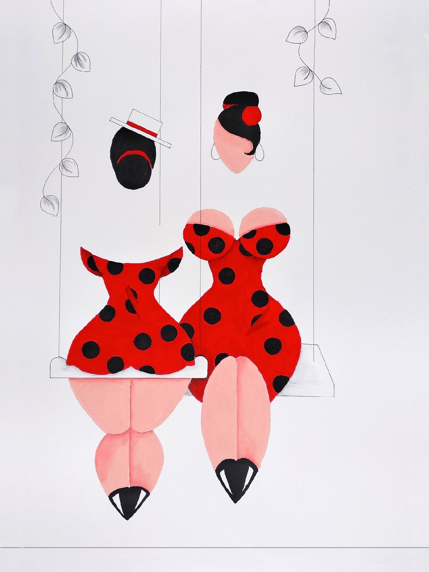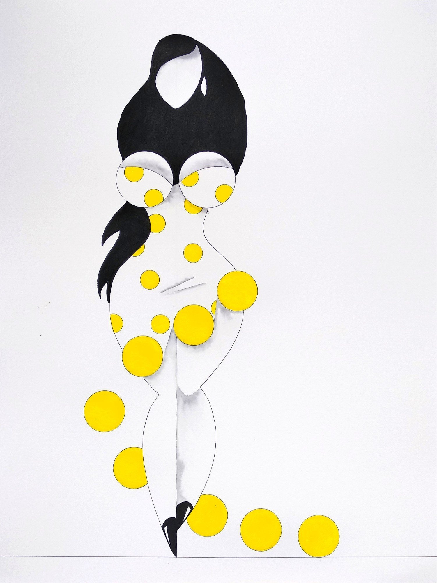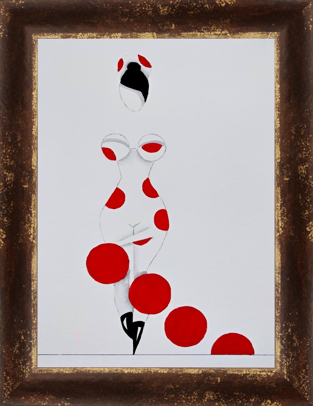 Las formas son simples, los colores puros, los fondos blancos. No hay brazos, ni cuello, ni rasgos que distraigan. La sensualidad aparece en la curva y en la presencia, no en el detalle.