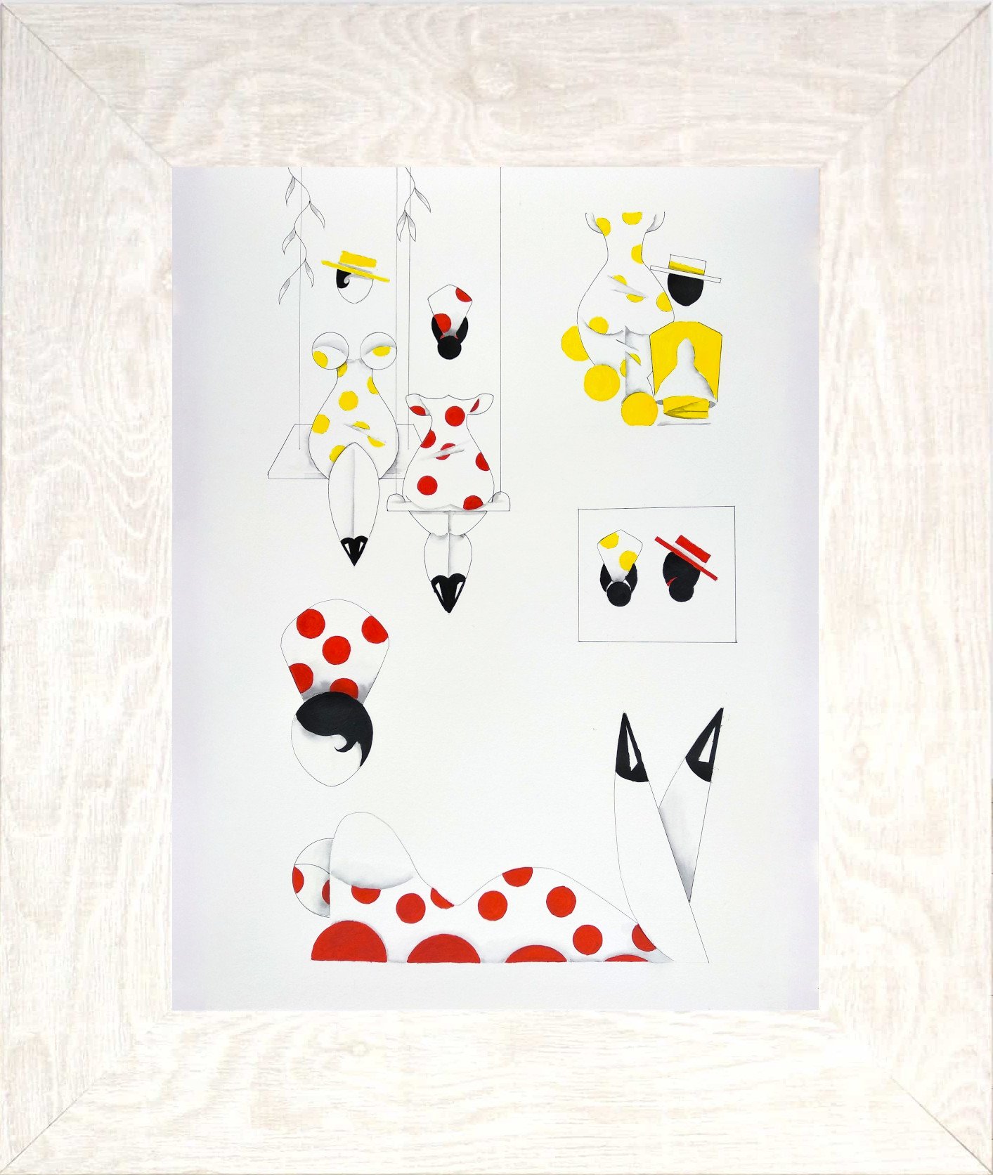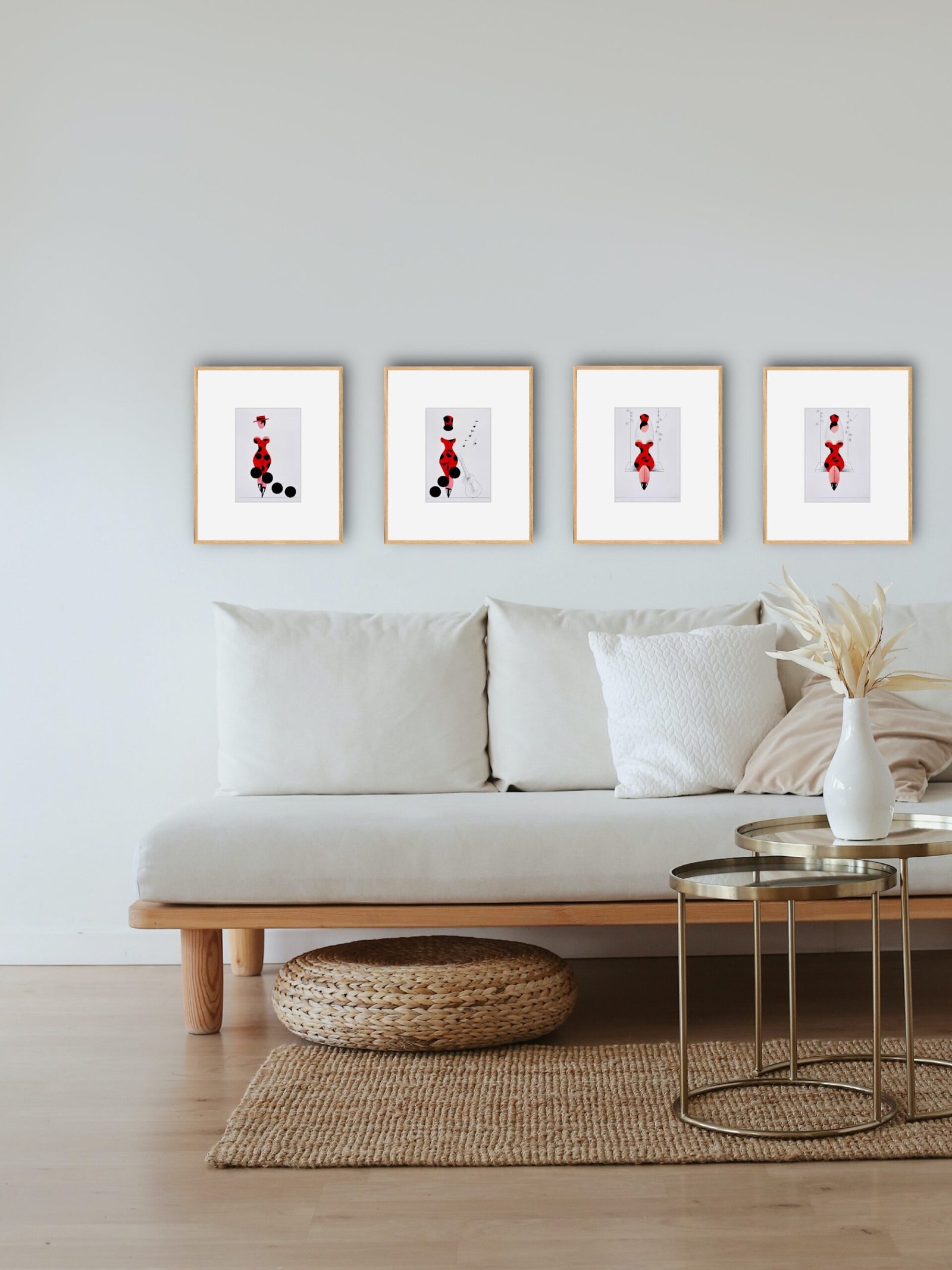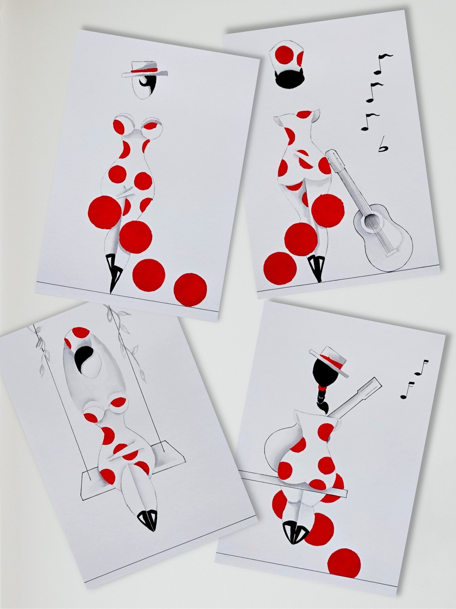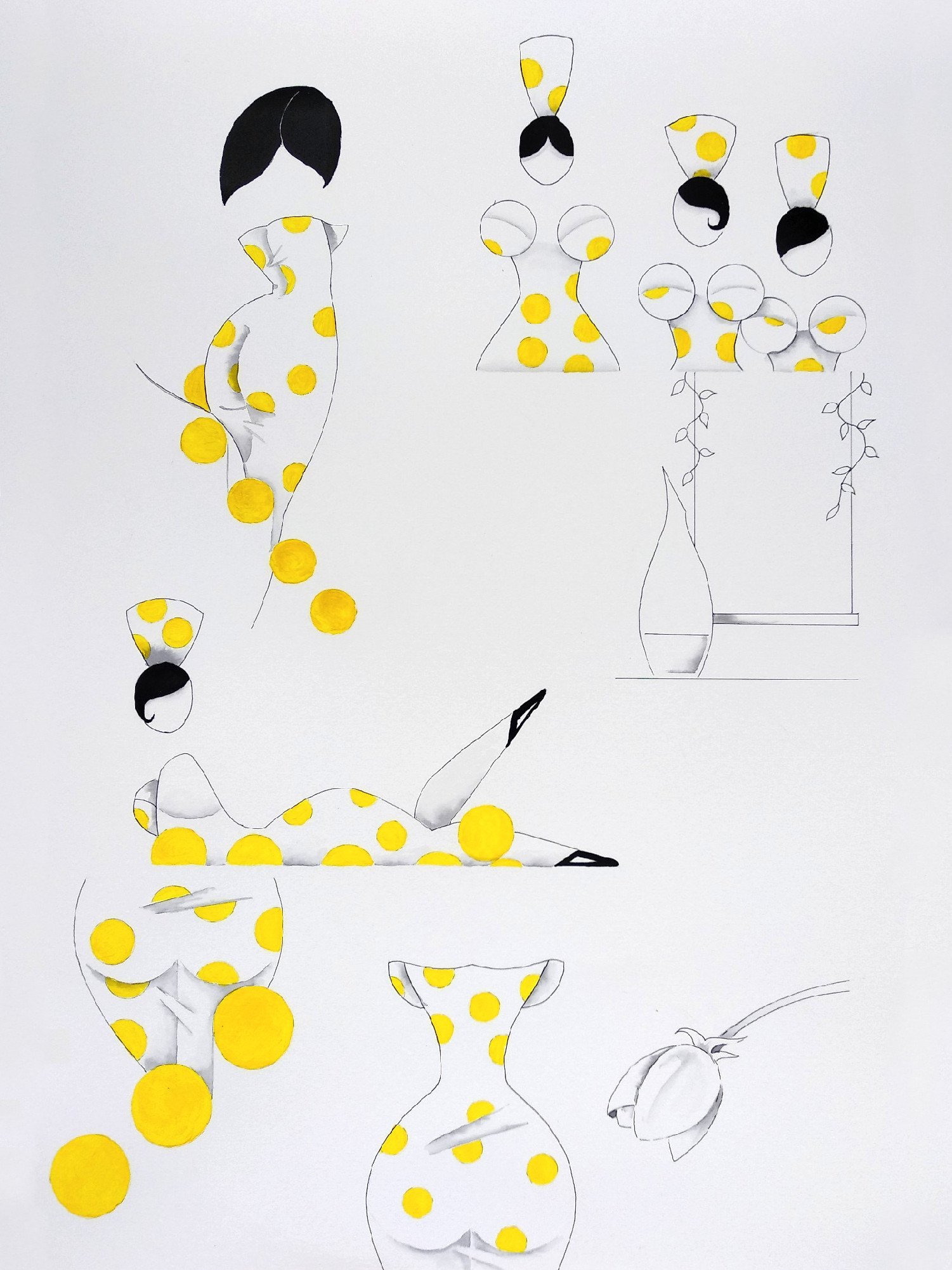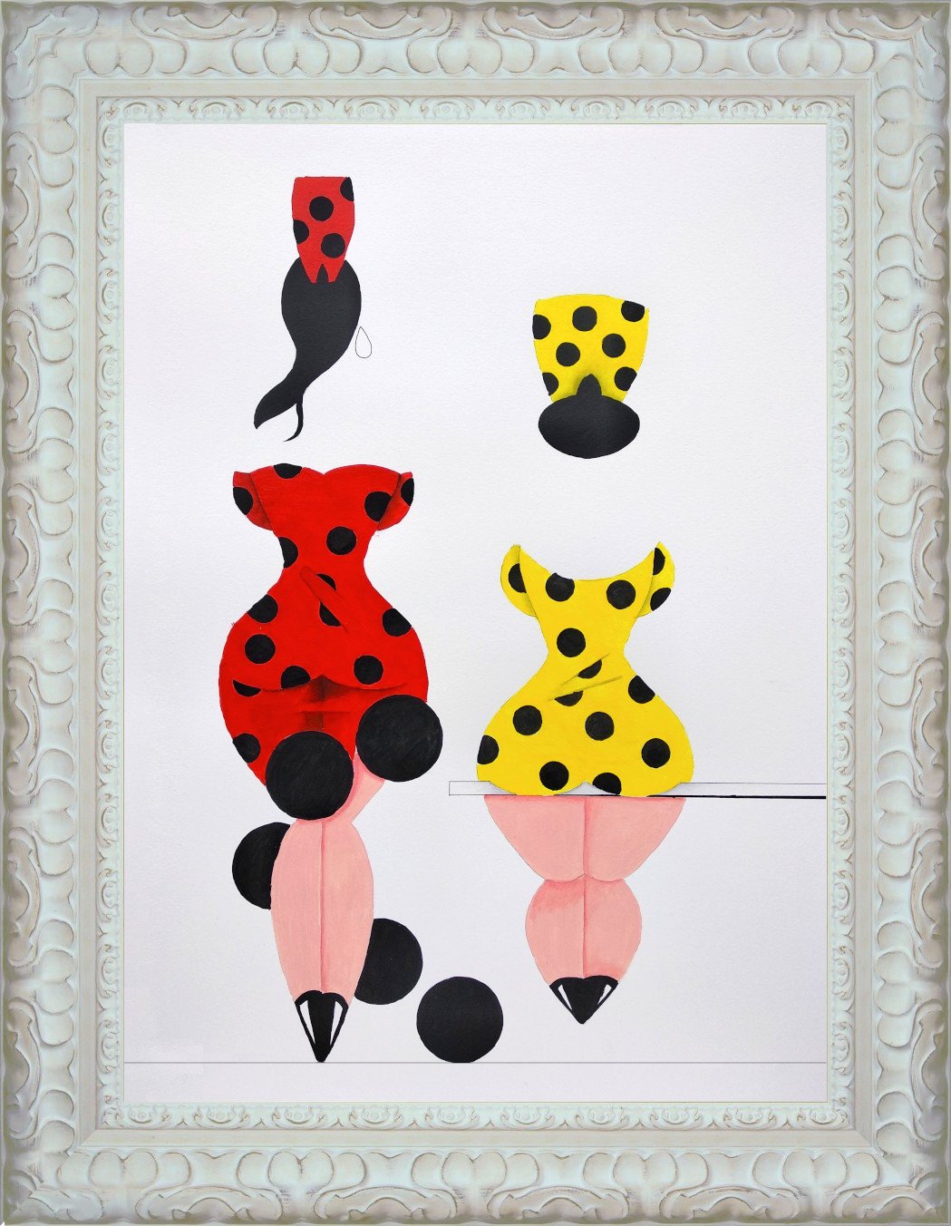 Las formas son simples, los colores puros, los fondos blancos. No hay brazos, ni cuello, ni rasgos que distraigan. La sensualidad aparece en la curva y en la presencia, no en el detalle.