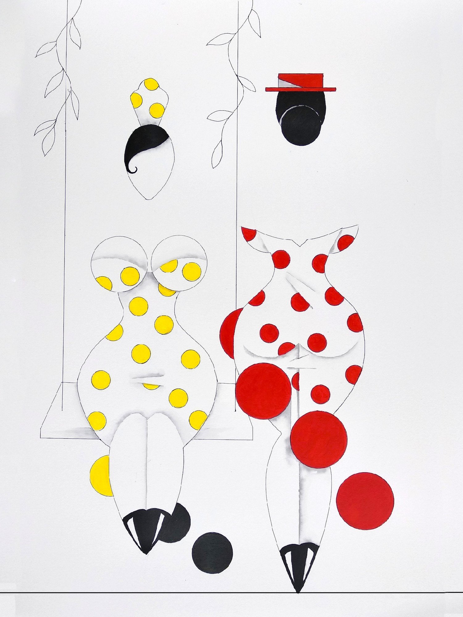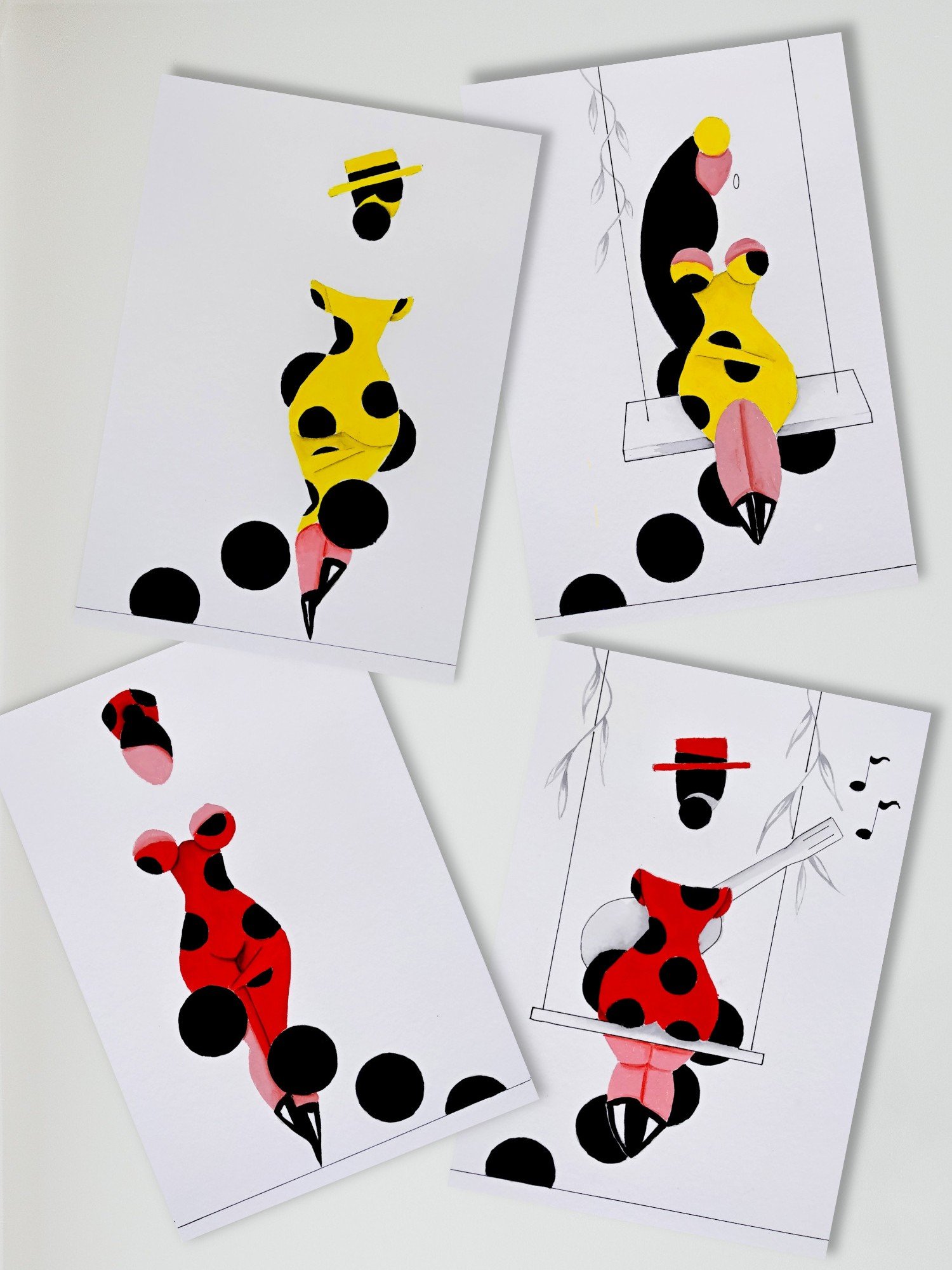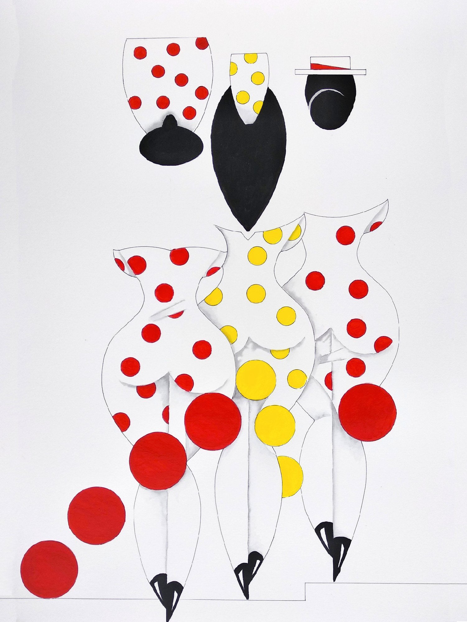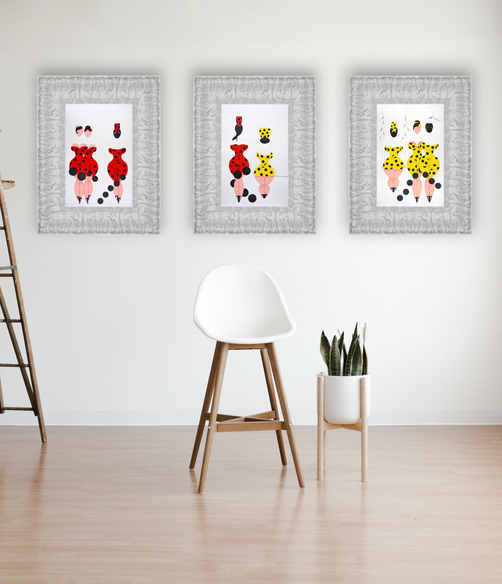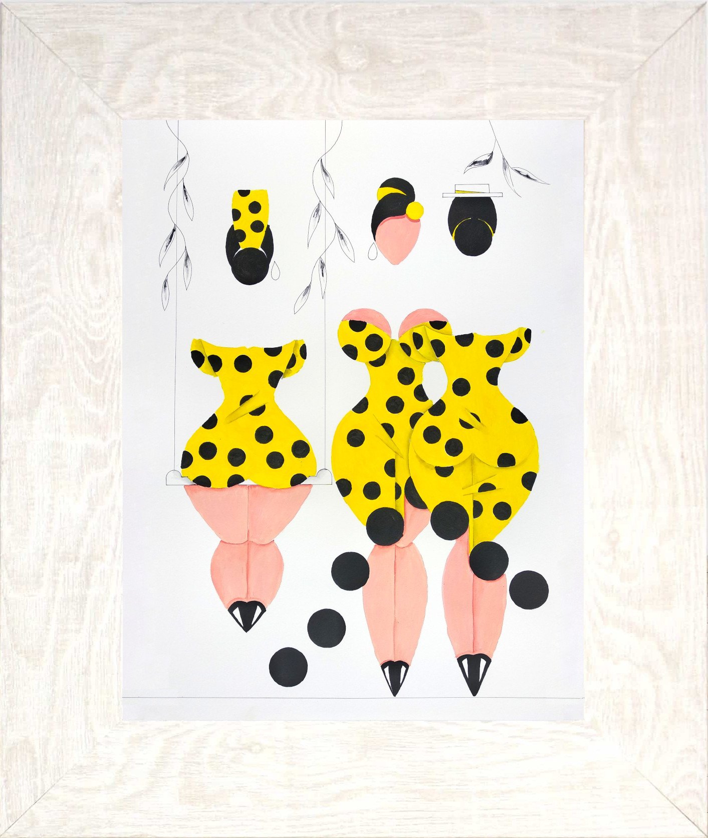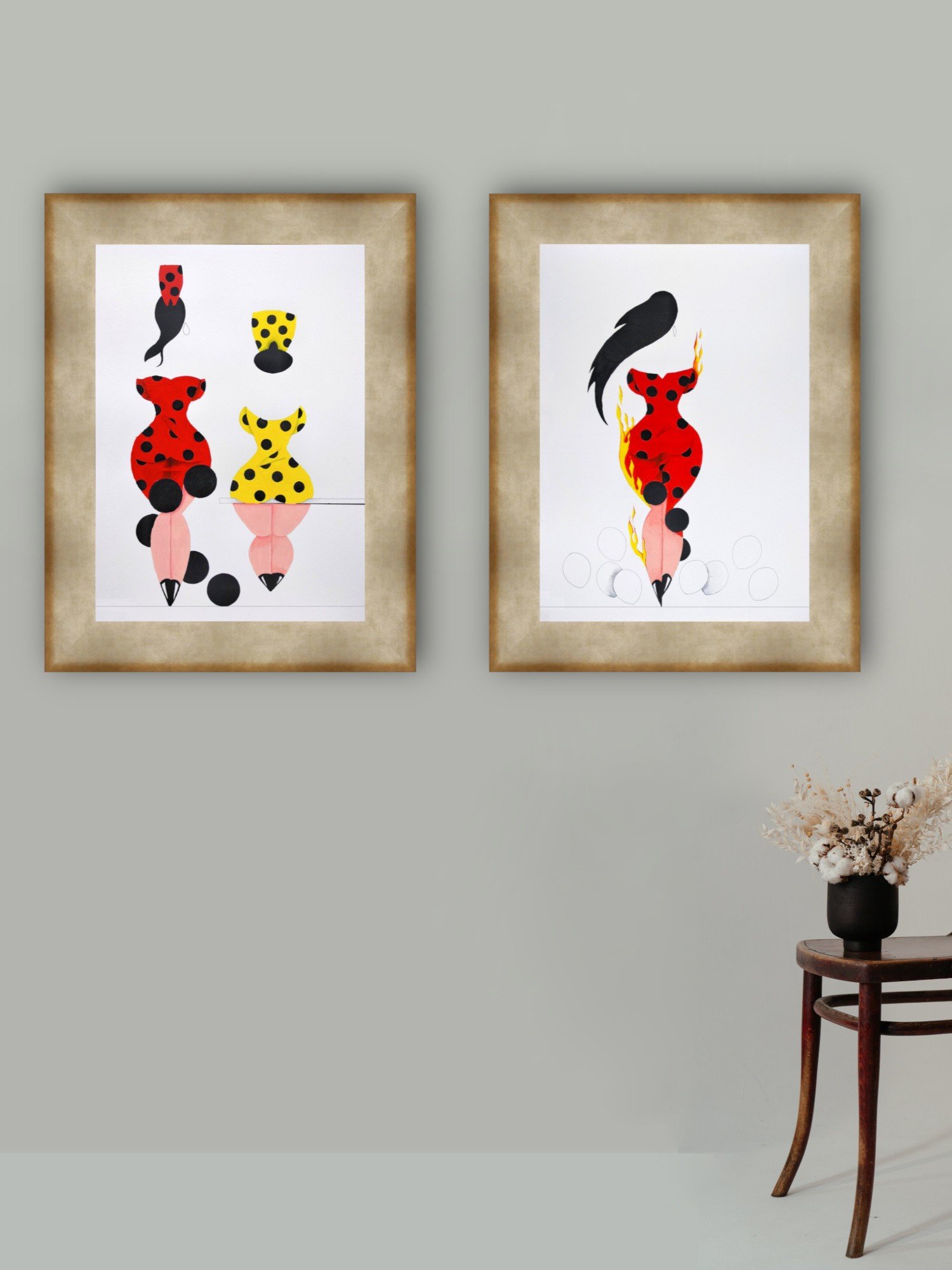 Las formas son simples, los colores puros, los fondos blancos. No hay brazos, ni cuello, ni rasgos que distraigan. La sensualidad aparece en la curva y en la presencia, no en el detalle.