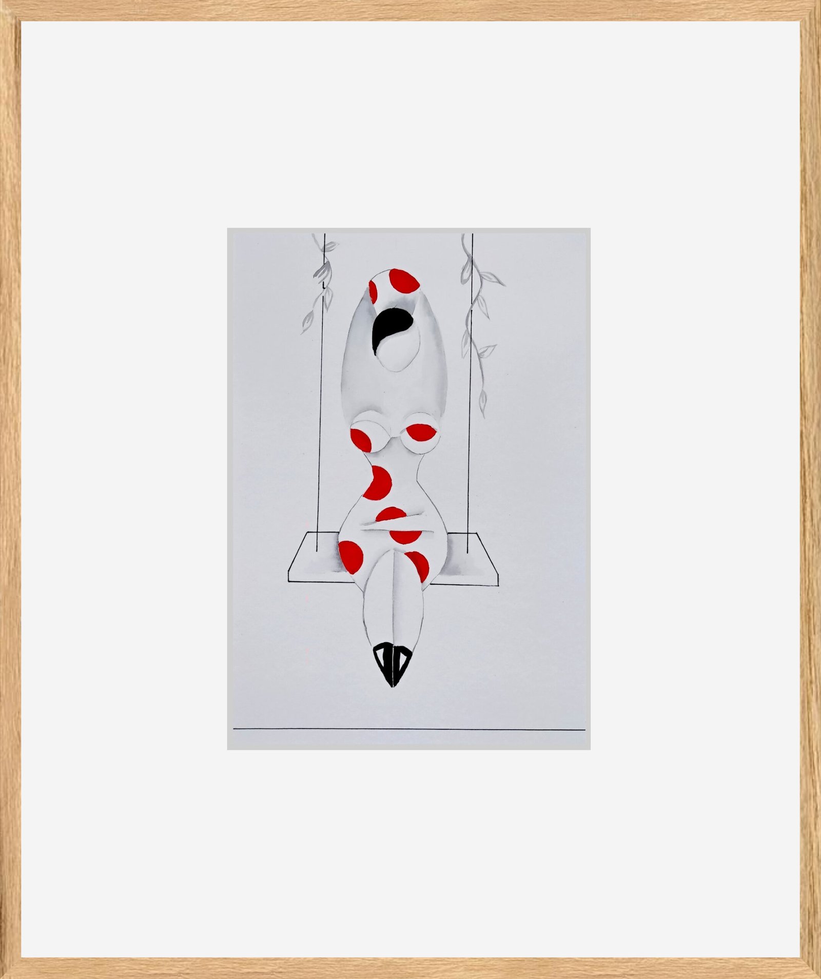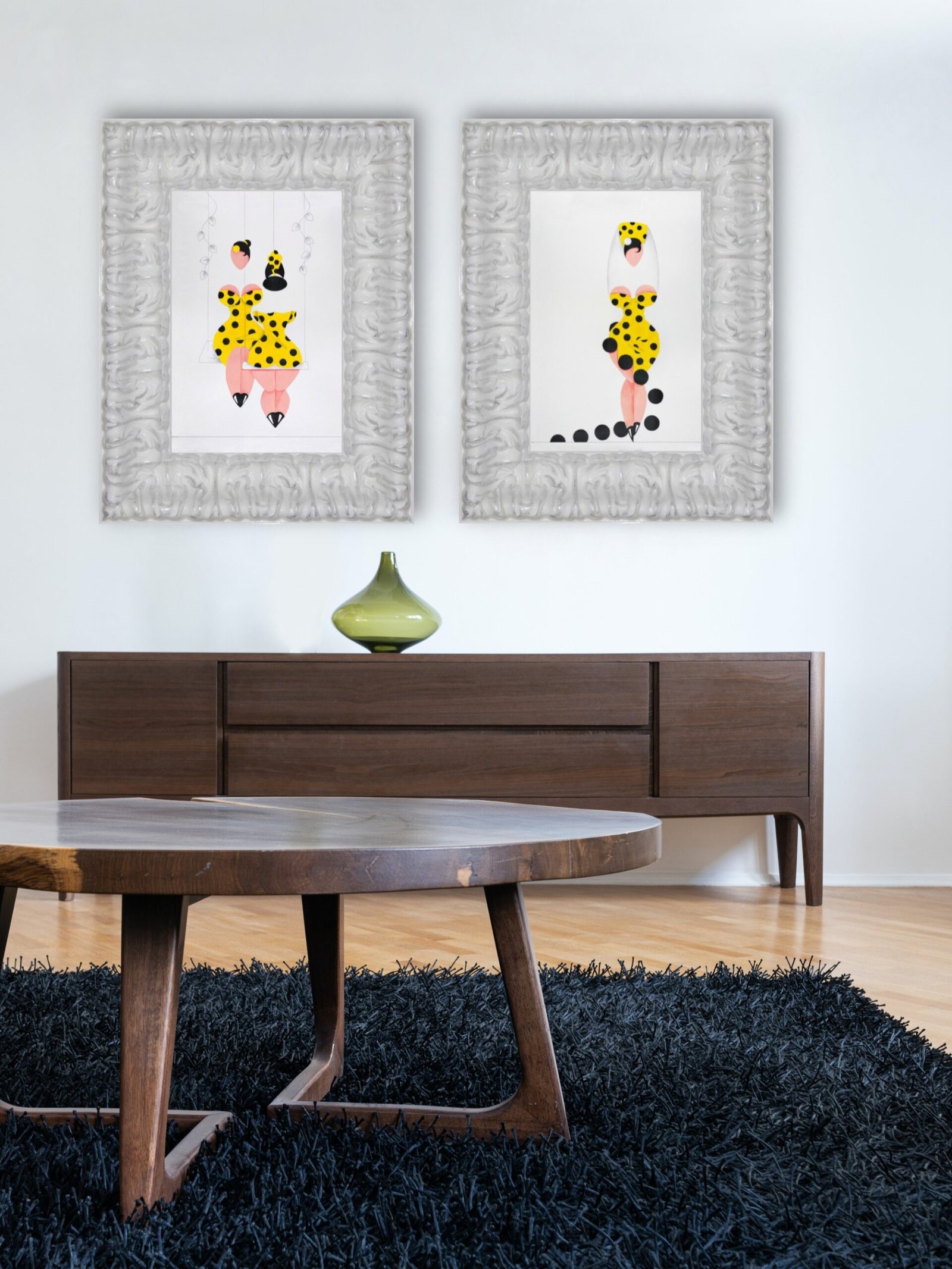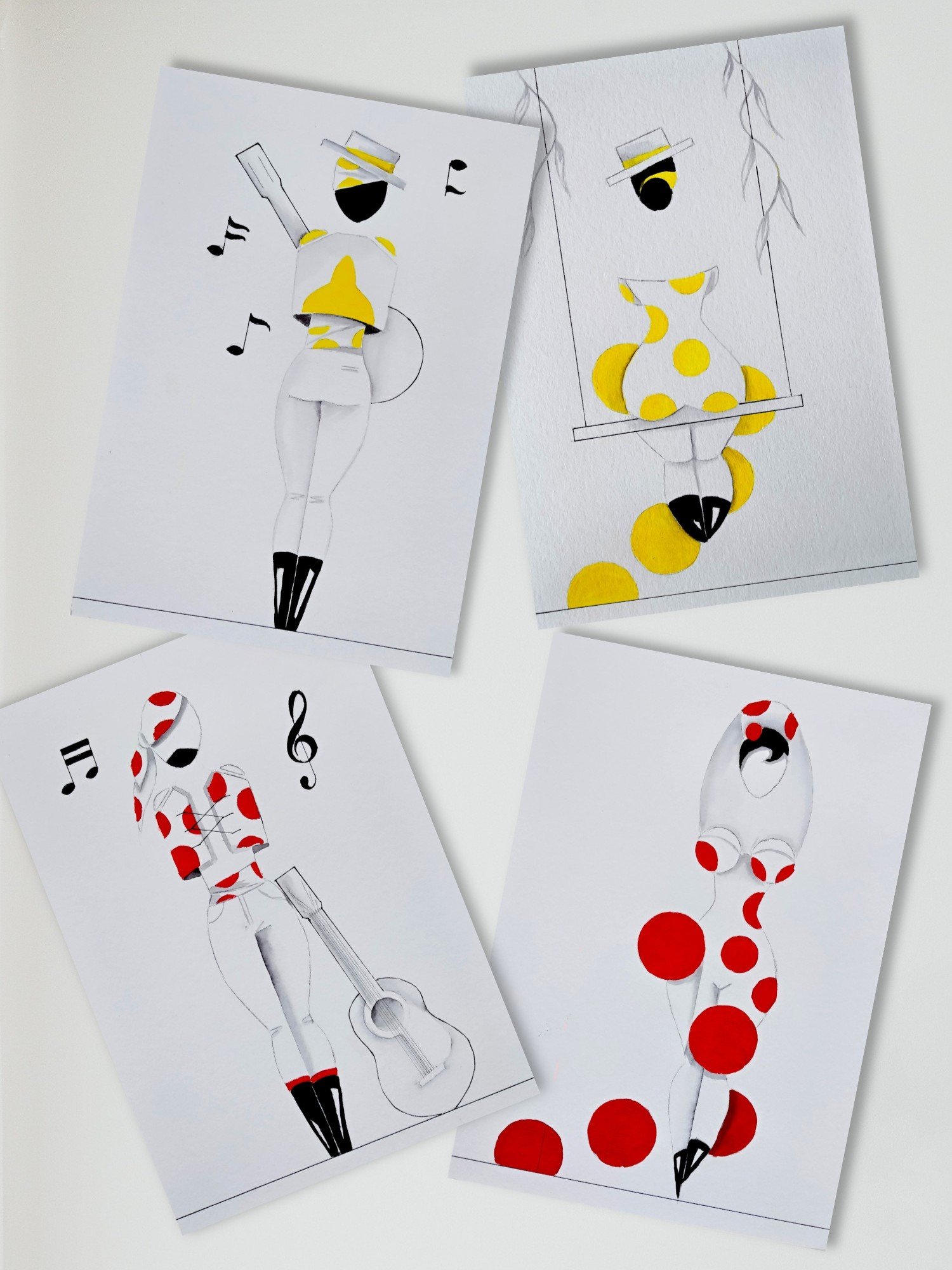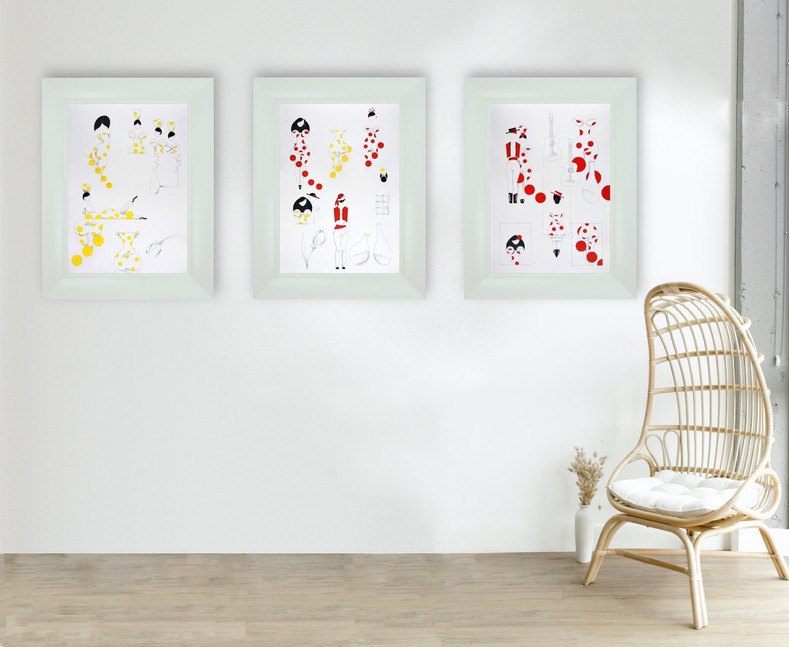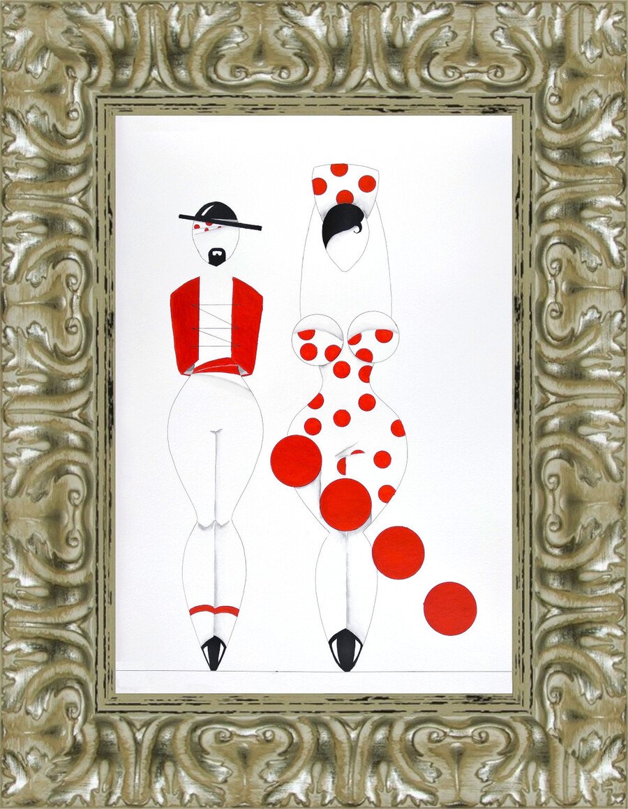 Las formas son simples, los colores puros, los fondos blancos. No hay brazos, ni cuello, ni rasgos que distraigan. La sensualidad aparece en la curva y en la presencia, no en el detalle.