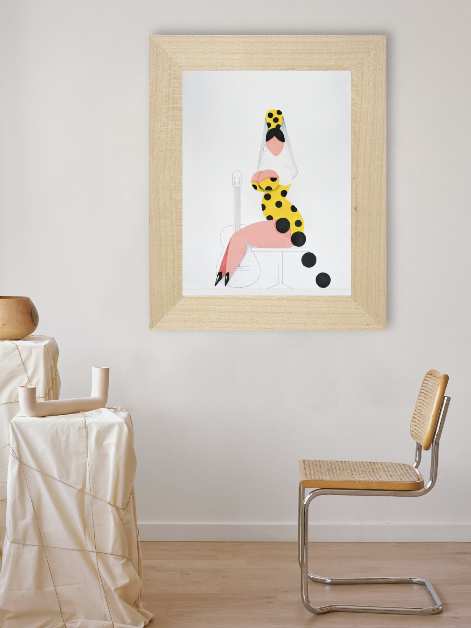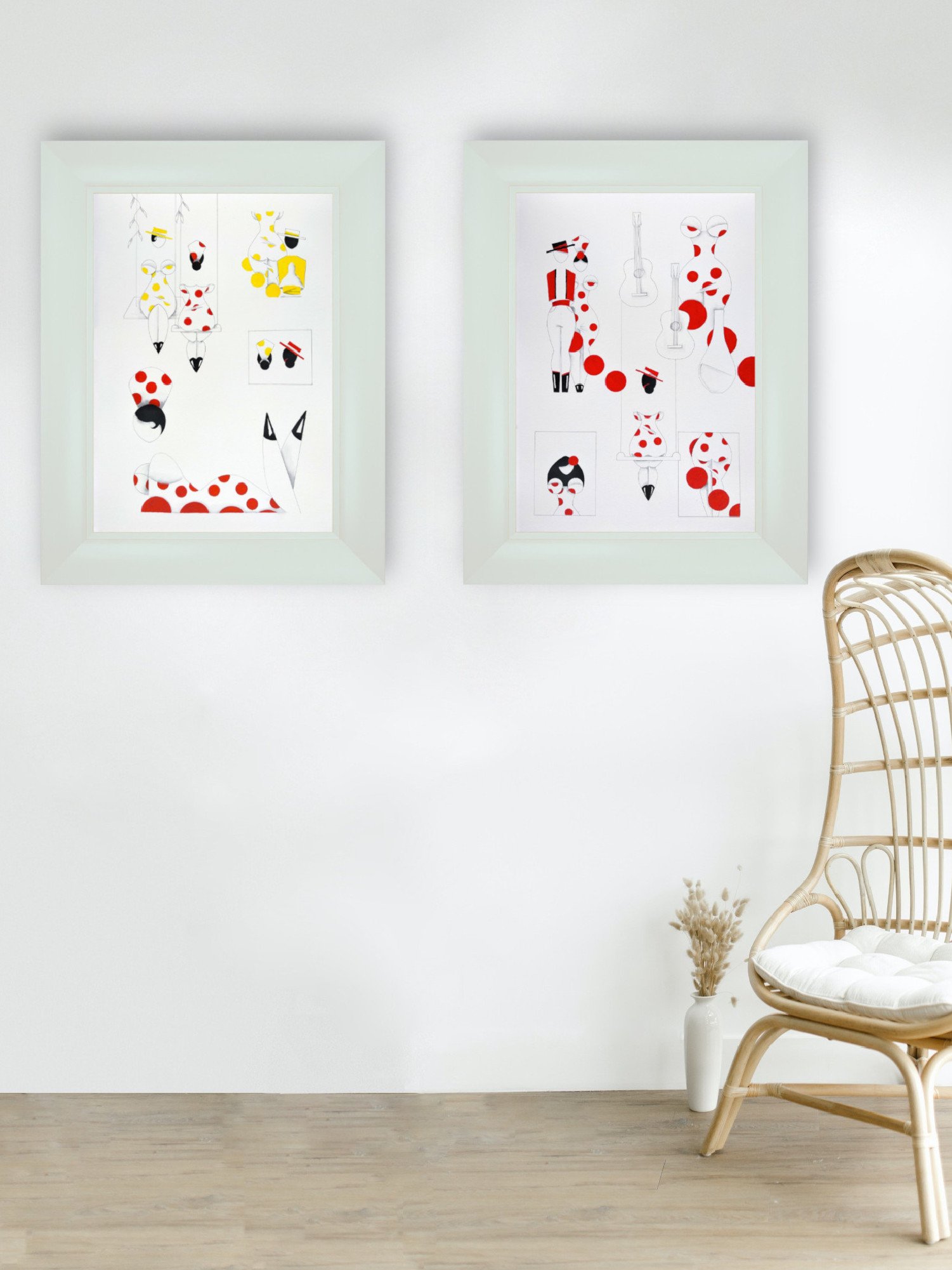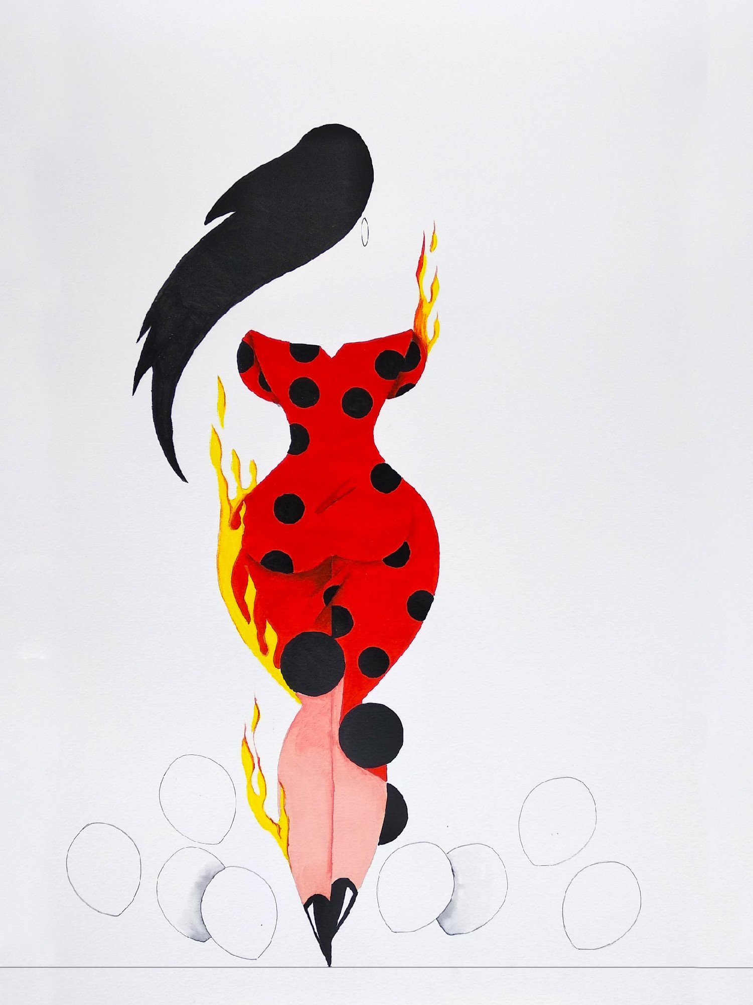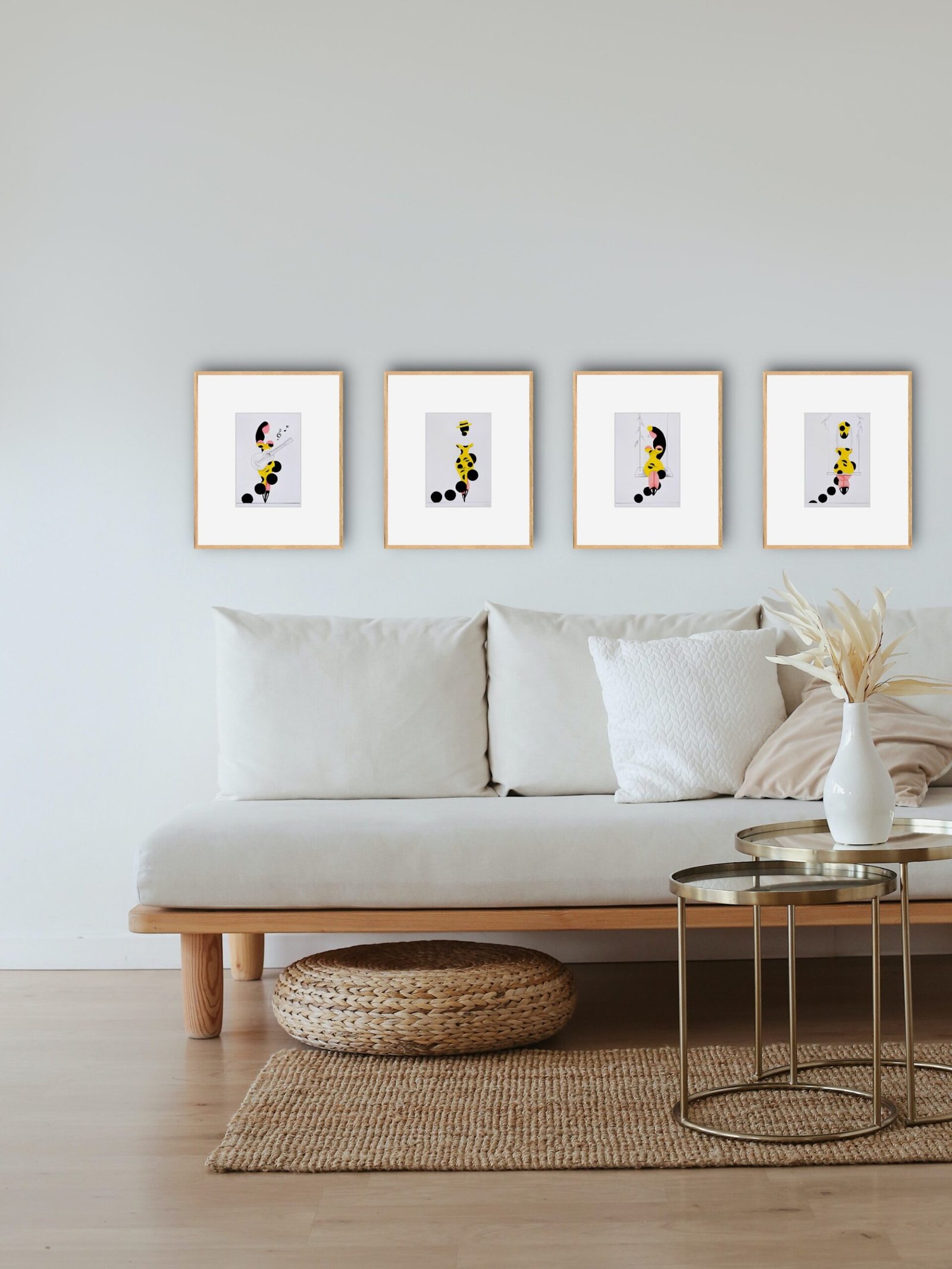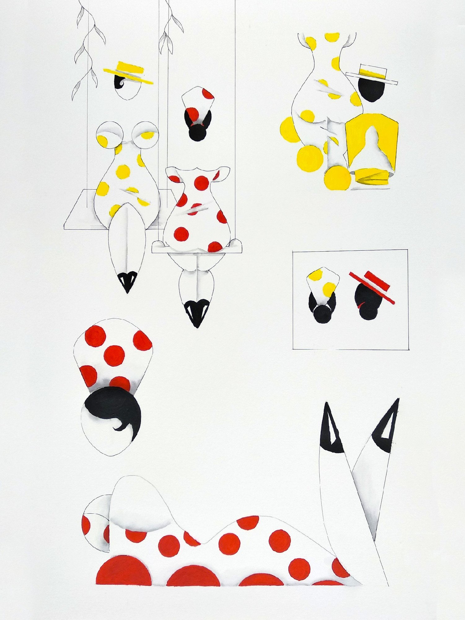 Las formas son simples, los colores puros, los fondos blancos. No hay brazos, ni cuello, ni rasgos que distraigan. La sensualidad aparece en la curva y en la presencia, no en el detalle.